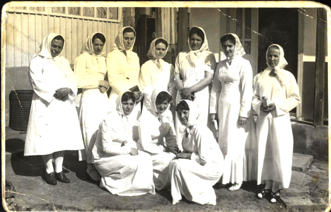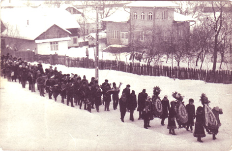 ![]() Corul bisericii în 1949 dirijata de Ilie Irimiciuc |
