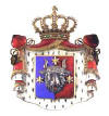 Cap de bour pe fond albastru si rosu, înconjurat de trei stele aurii |