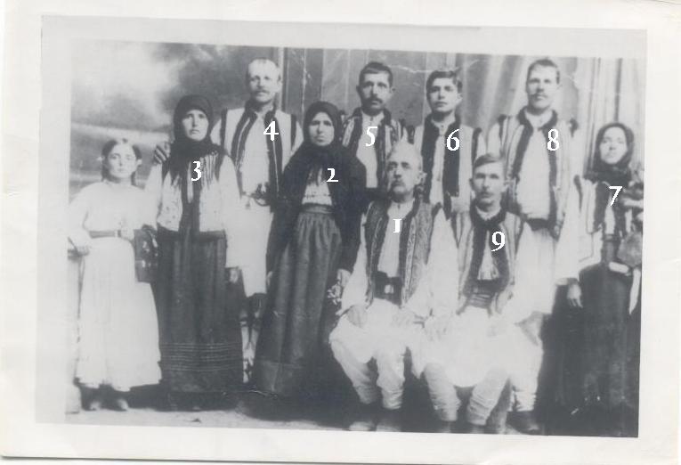 Fotografia familiei lui Gregor Hostiuc 1 - Tatal Georgi, 2- mama Stefana nascuta Curec, 3- sora Domnica & 4 cumnatul Toader Crasi, 5- fratele Nicolai, 6- fratele Stefan, 7- sora Maria & 8 sotul ei, 9-un unchi (foto ante 1922, Stefan murise în acest an)