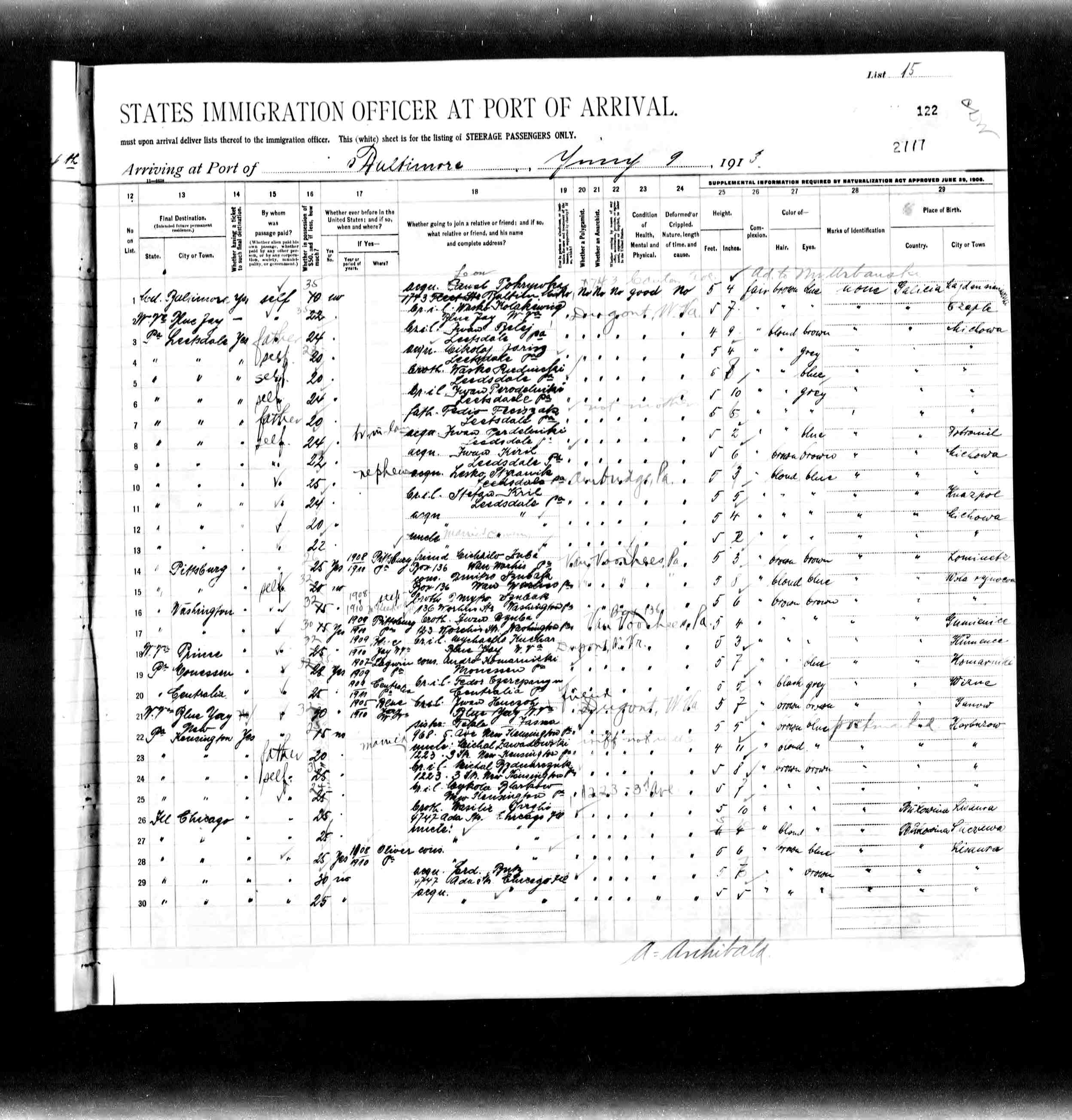 1909 SS Alice Trieste-New York (28 ian-17 febr), îl gasim pe Gulei Nicolai, 43 de ani, Liroschi Petru 30 ani si pe Policiuc Vasile 25 de ani din familia lui Boshtanek cu destinatia "La Bogalusa" Luiziana, la fratele si respectiv unchiul, Georgi Gulei, instalat cu doi ani înainte. Pe Policiuc Vasile îl mai gasim pe un alt vapor, "Montreal", pe 26 apr 1927, plecând din Hamburg spre Canada.