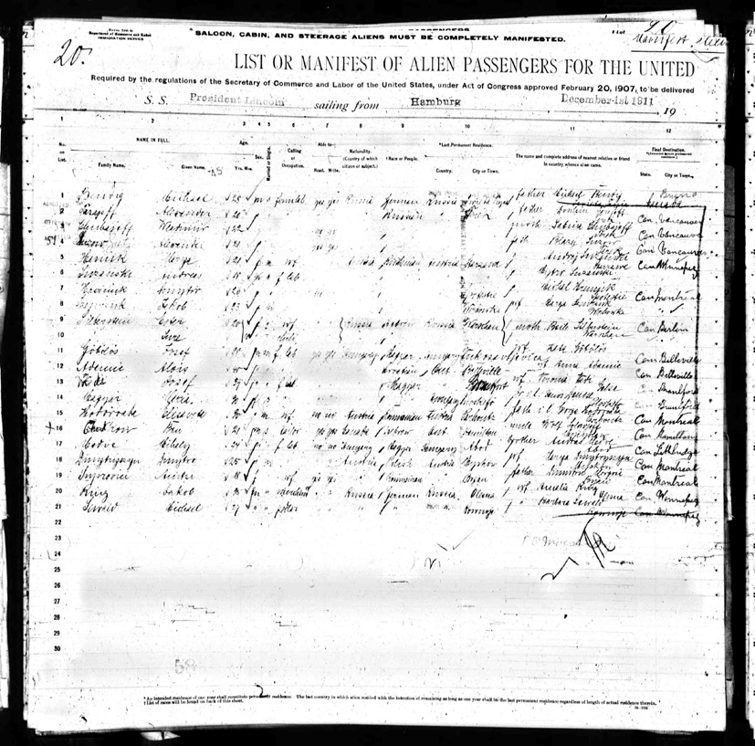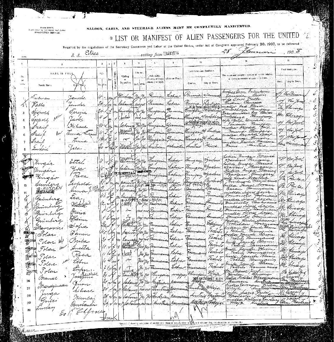 Trieste - La New Orleans 20 oct - 18 nov. 1907 Gulei Nicolai 38 ani(casatorit cu Anica), Hreniuc Petru 25 de ani (casatorit cu Mafta), Hostiuc Nicolai (mama Parasca) 25 de ani, Hreniuc Ion, 24 ani (a lui Toader) si Senciuc Nicolai (a lui Semeon), 15 ani, minor exclus la sosire. Toti figurau ca lucratori agricoli.