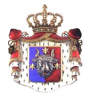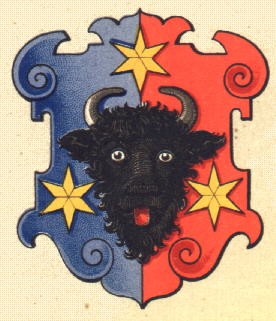Cap de bour pe fond albastru si rosu, înconjurat de trei stele aurii |