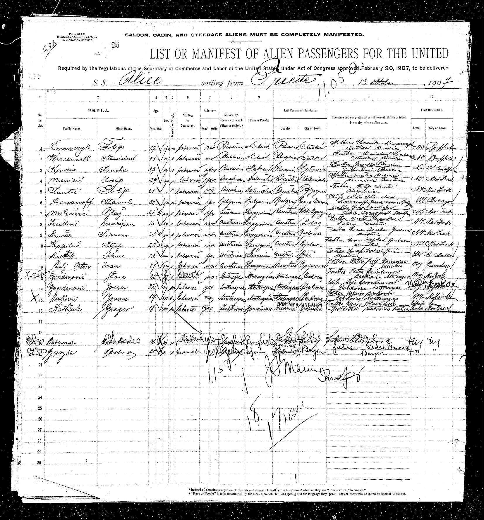 Hostiuc Gregor 1881-1953. 18 ani (în realitate 26 de ani). Nr. 16 pe lista de pasageri al vaporului SS Alice plecat din Trieste spre New York între 13 oct. - 1 nov. 1907. Este fiul lui Georgi a lui Ioan a lui Iosif Hostiuc din Ipotesti si Stefana nascuta Curec, probabil din Tisautzi. Este în tranzit spre Montreal, Canada unde merge la un prieten Tanasi Schaffer. Anul urmator, Gregor pleaca spre SUA si se stabileste mai întâi în statul Michigan apoi în Ohio. S-a casatorit cu Caroline Nickley si a avut 4 copii. Trei baieti si o fata. A lucrat în constructii si vorbea 7 limbi. În America numele sau era « Gregory Hostuck ». Nu s-a mai întors niciodata în Ipotesti dar a pastrat legatura cu tatal sau Georgi. A murit în statul Ohio la vârsta de 72 de ani. |