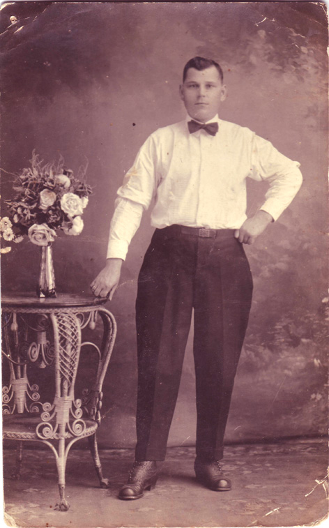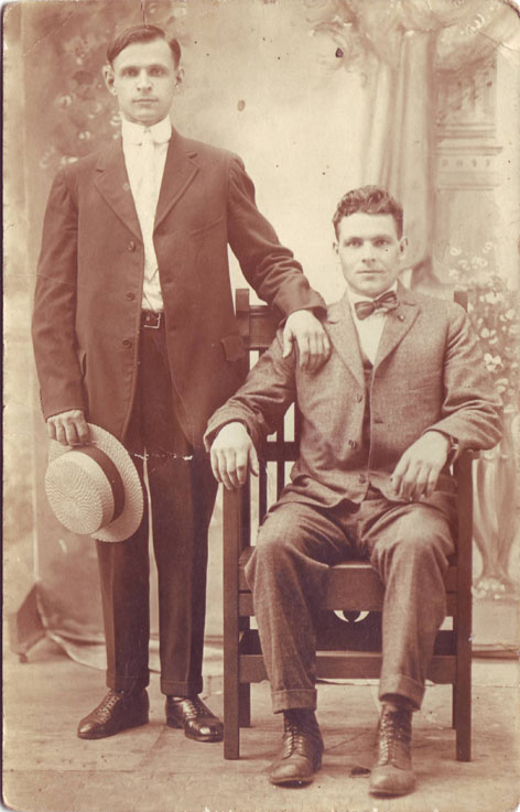 Sainiuc Stefan nascut in 1881, paca, rândul 2 dreapta, cu alti emigranti, undeva in America, anul 1925 |