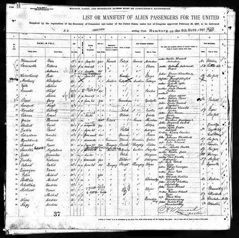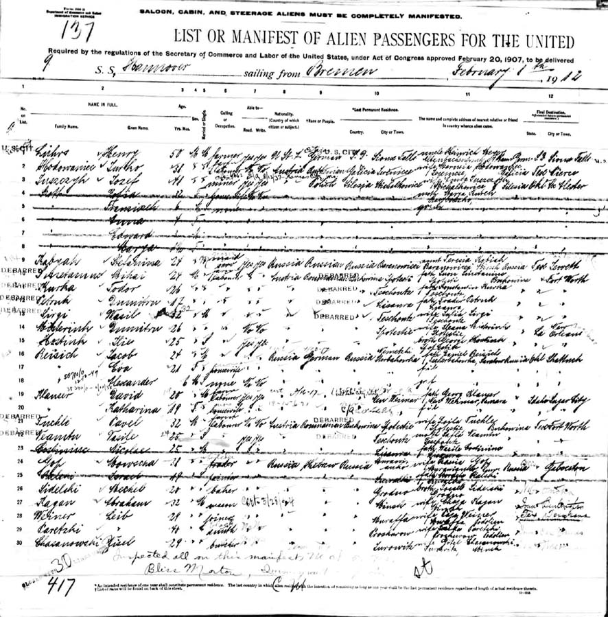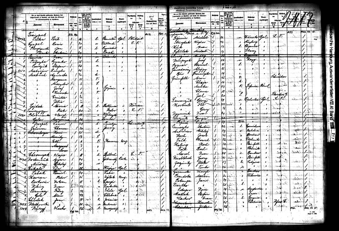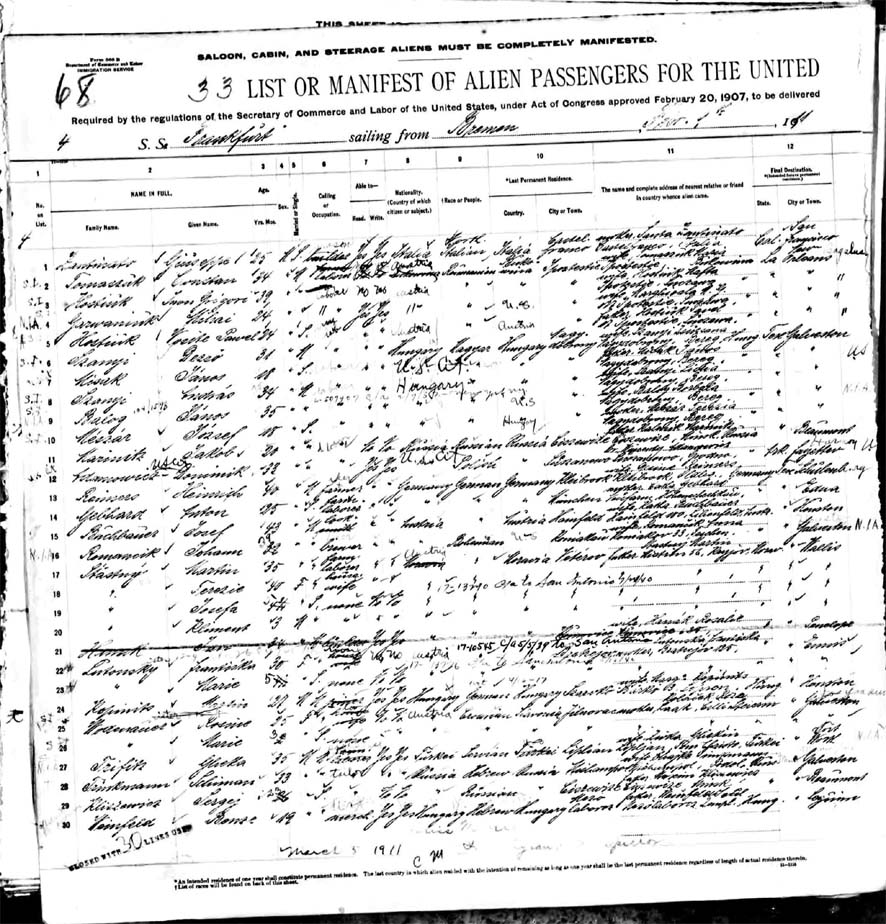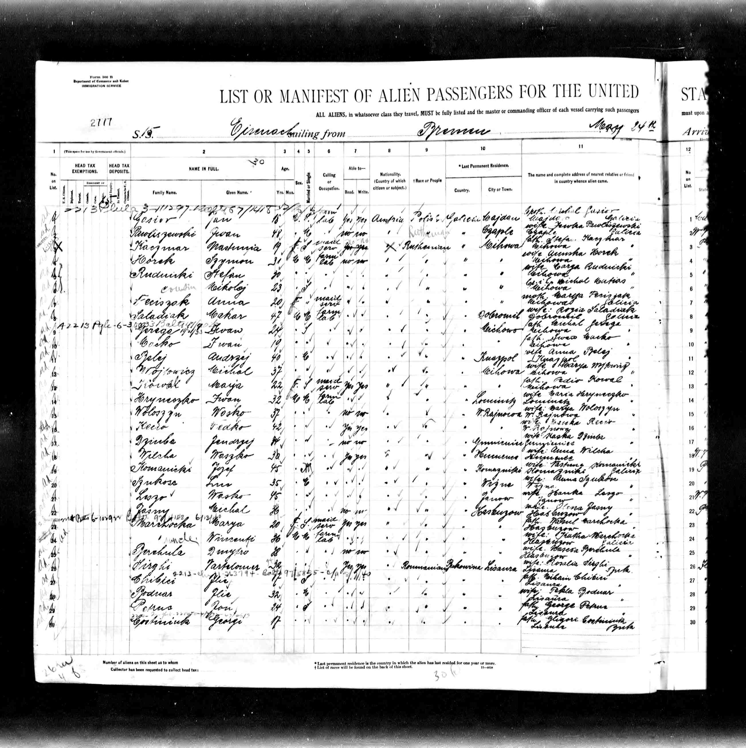 Trieste - La New Orleans 20 oct - 18 nov. 1907 Gulei Nicolai 38 ani(casatorit cu Anica), Hreniuc Petru 25 de ani (casatorit cu Mafta), Hostiuc Nicolai (mama Parasca) 25 de ani, Hreniuc Ion, 24 ani (a lui Toader) si Senciuc Nicolai (a lui Semeon), 15 ani, minor exclus la sosire. Toti figurau ca lucratori agricoli.