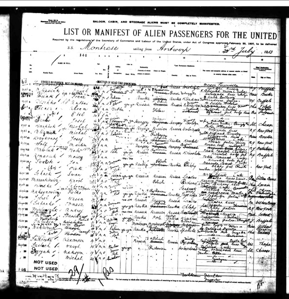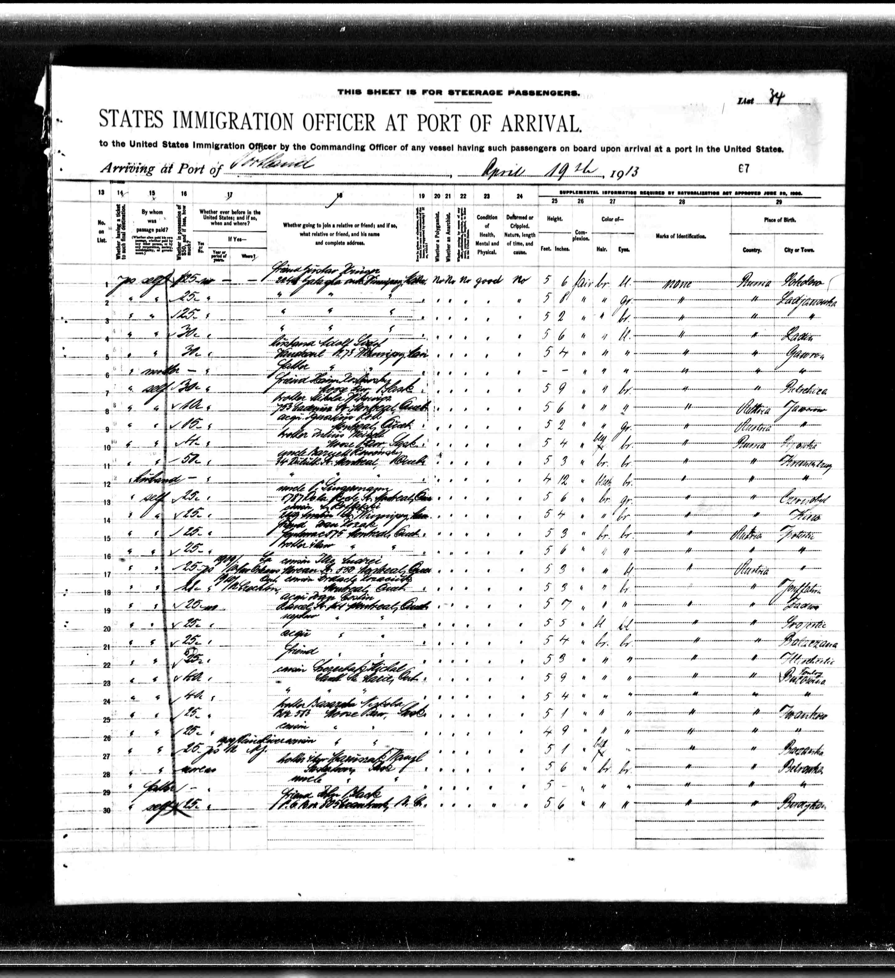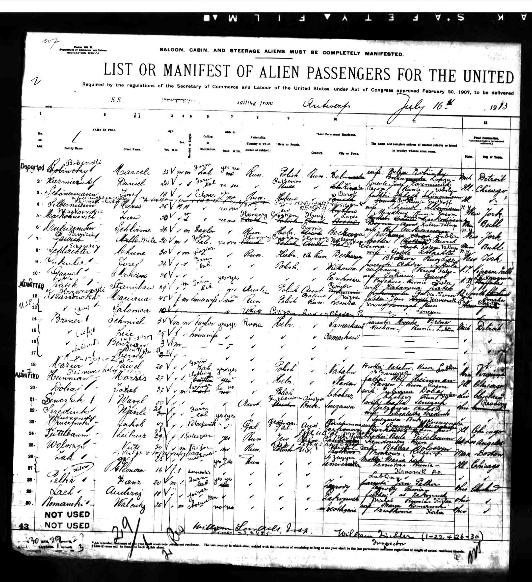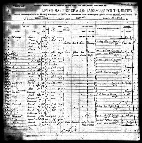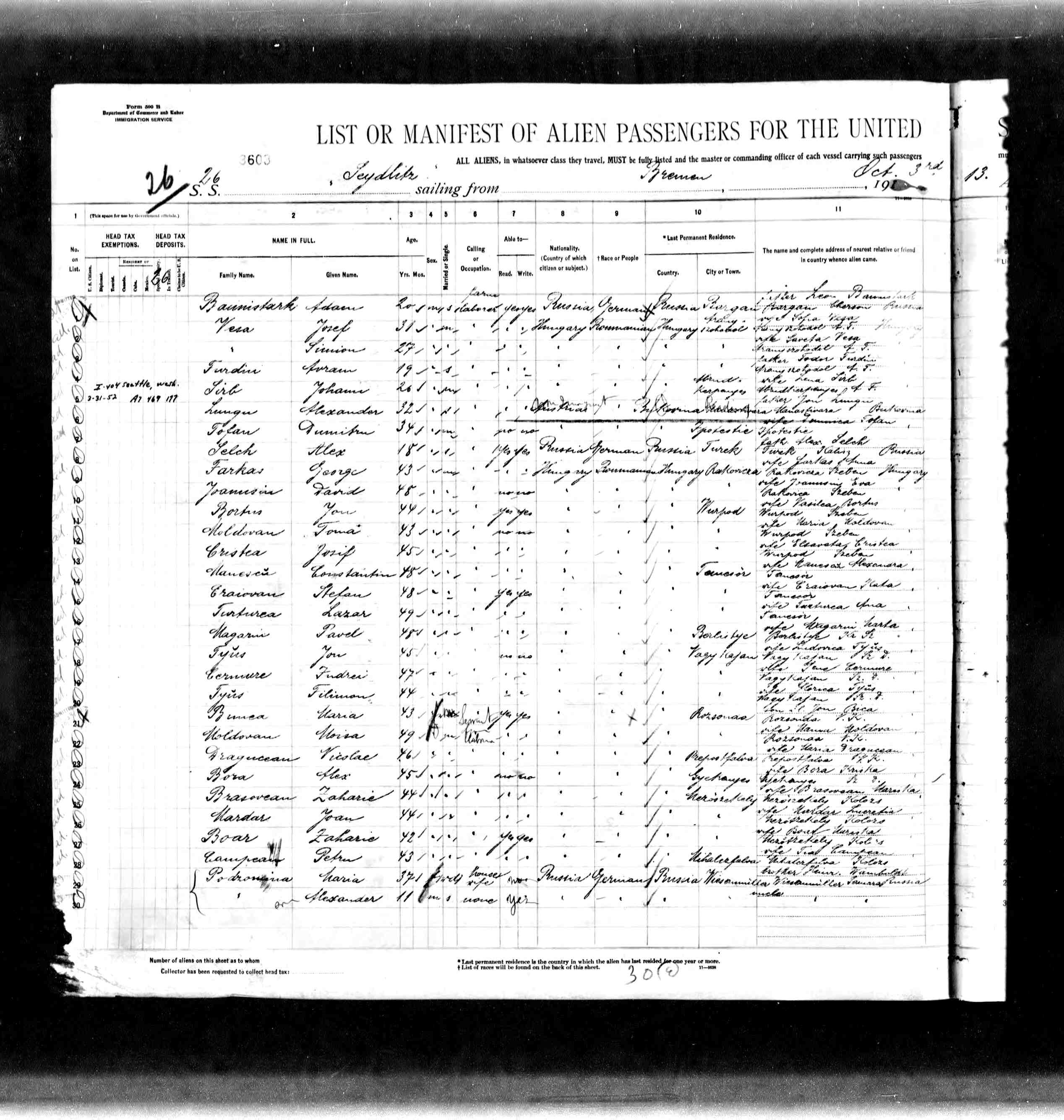 Trieste - La New Orleans 20 oct - 18 nov. 1907 Gulei Nicolai 38 ani(casatorit cu Anica), Hreniuc Petru 25 de ani (casatorit cu Mafta), Hostiuc Nicolai (mama Parasca) 25 de ani, Hreniuc Ion, 24 ani (a lui Toader) si Senciuc Nicolai (a lui Semeon), 15 ani, minor exclus la sosire. Toti figurau ca lucratori agricoli.
