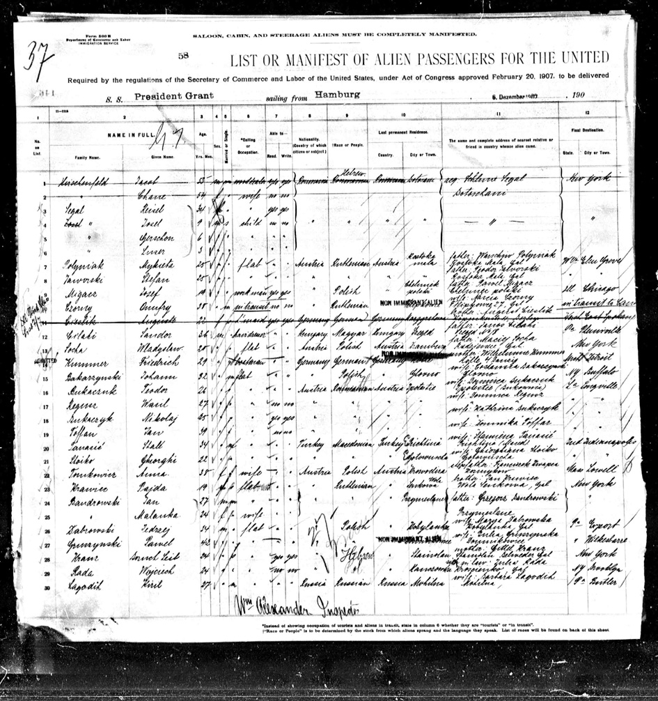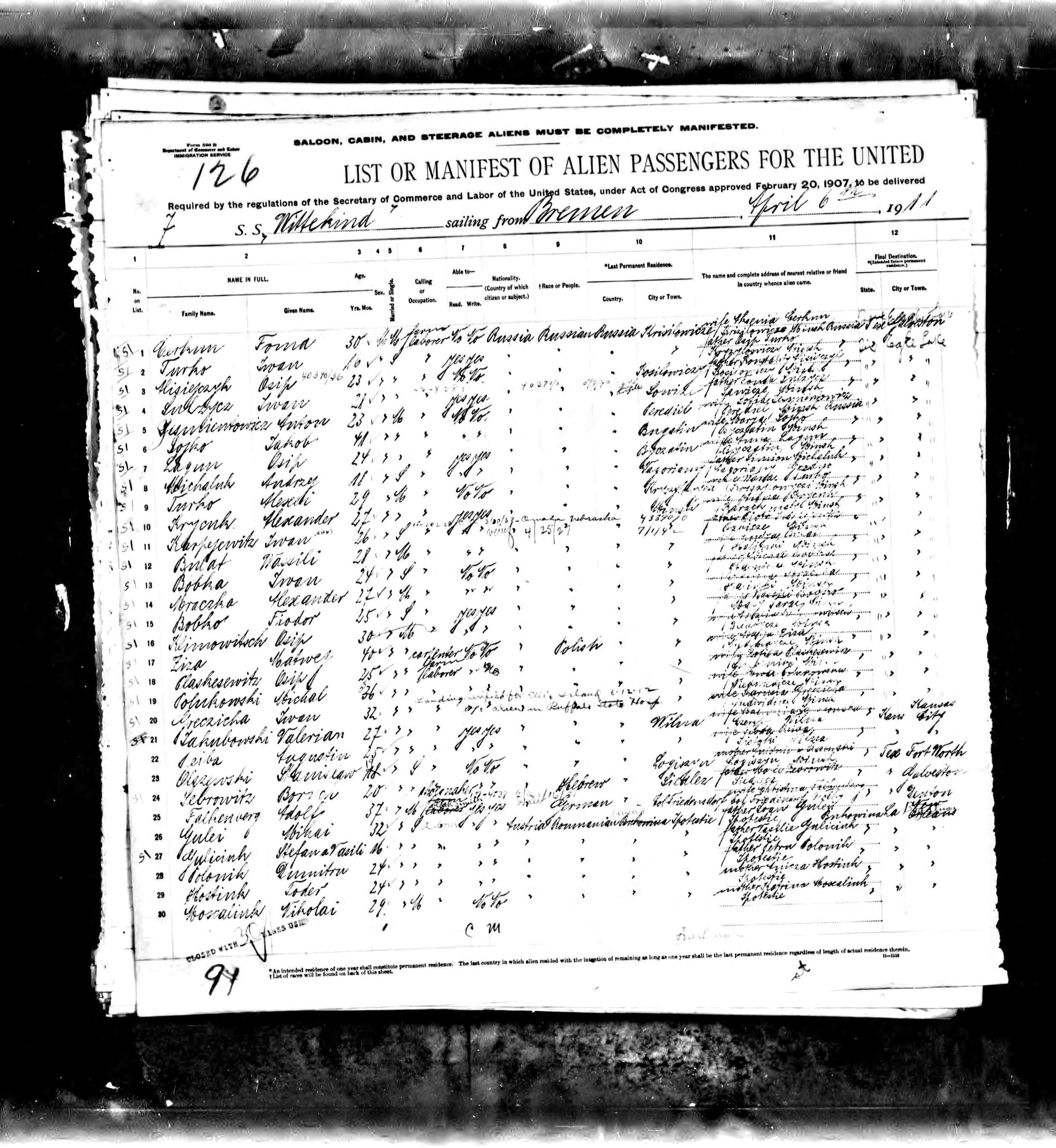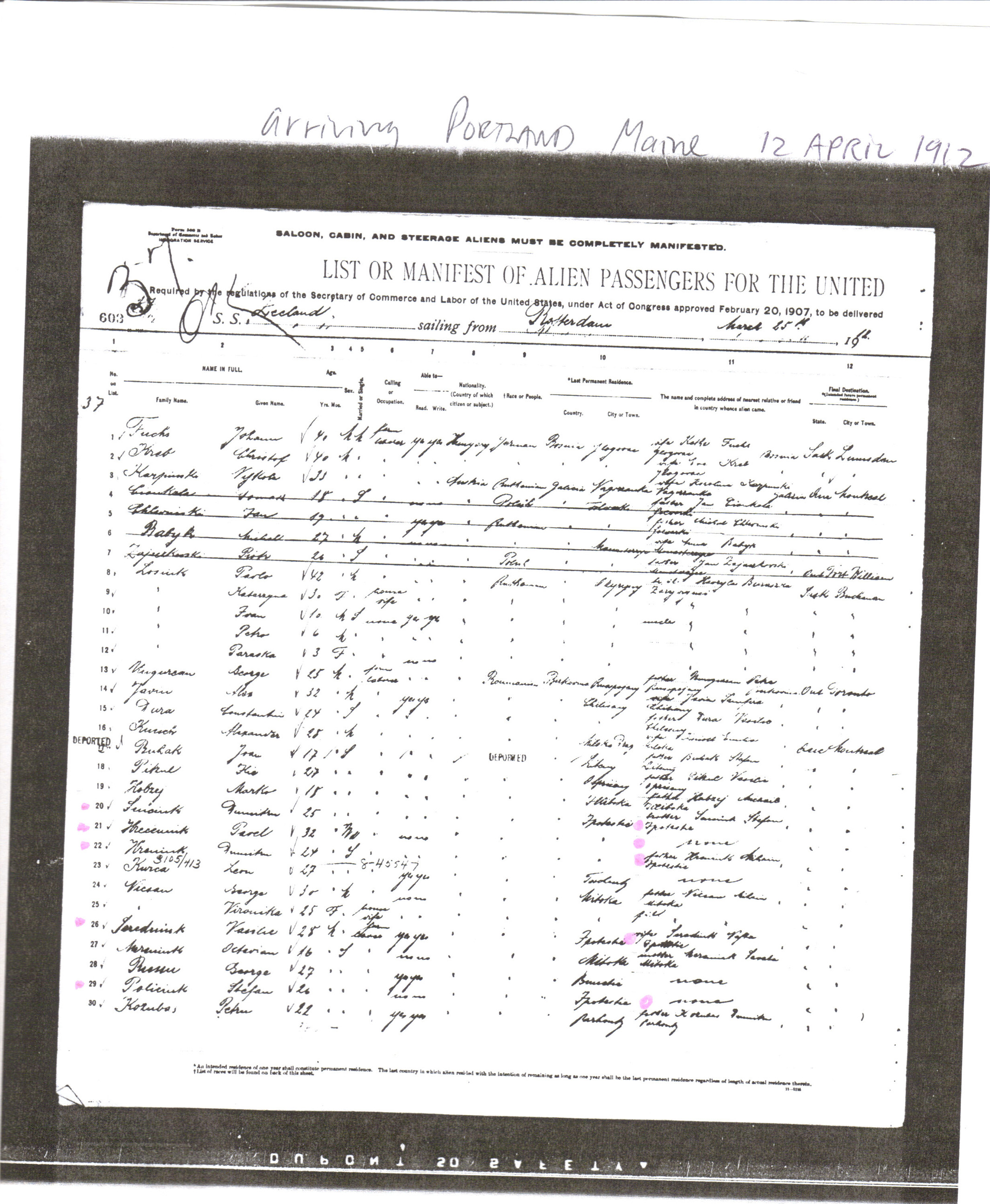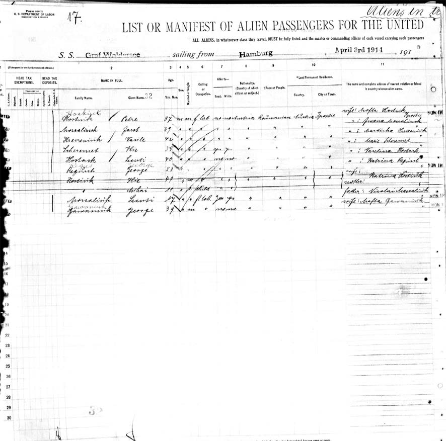 1909 SS Alice Trieste-New York (28 ian-17 febr), îl gasim pe Gulei Nicolai, 43 de ani, Liroschi Petru 30 ani si pe Policiuc Vasile 25 de ani din familia lui Boshtanek cu destinatia "La Bogalusa" Luiziana, la fratele si respectiv unchiul, Georgi Gulei, instalat cu doi ani înainte. Pe Policiuc Vasile îl mai gasim pe un alt vapor, "Montreal", pe 26 apr 1927, plecând din Hamburg spre Canada.